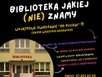 19:30 BIBLIOTEKA JAKIEJ (NIE) ZNAMY – wyjątkowe zwiedzanie biblioteki „od kuchni”. Tym razem czytelnicy będą mogli „wejść w buty” bibliotekarza, zajrzeć do tajemniczych zakamarków biblioteki, do których na co dzień nie ma dostępu, a także skorzystać z przygotowanych atrakcji.