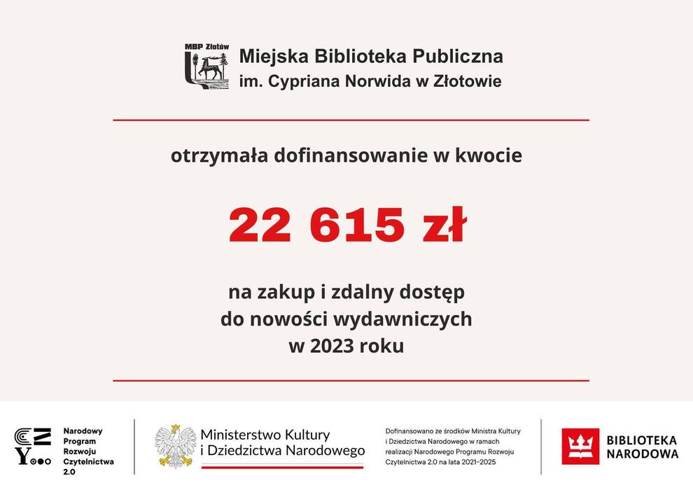17 lipca otrzymaliśmy dofinansowanie w kwocie 22 615 zł na ”Zakup i zdalny dostęp do nowości wydawniczych w ramach Narodowego Programu Rozwoju Czytelnictwa 2.0 na lata 2021-2025".